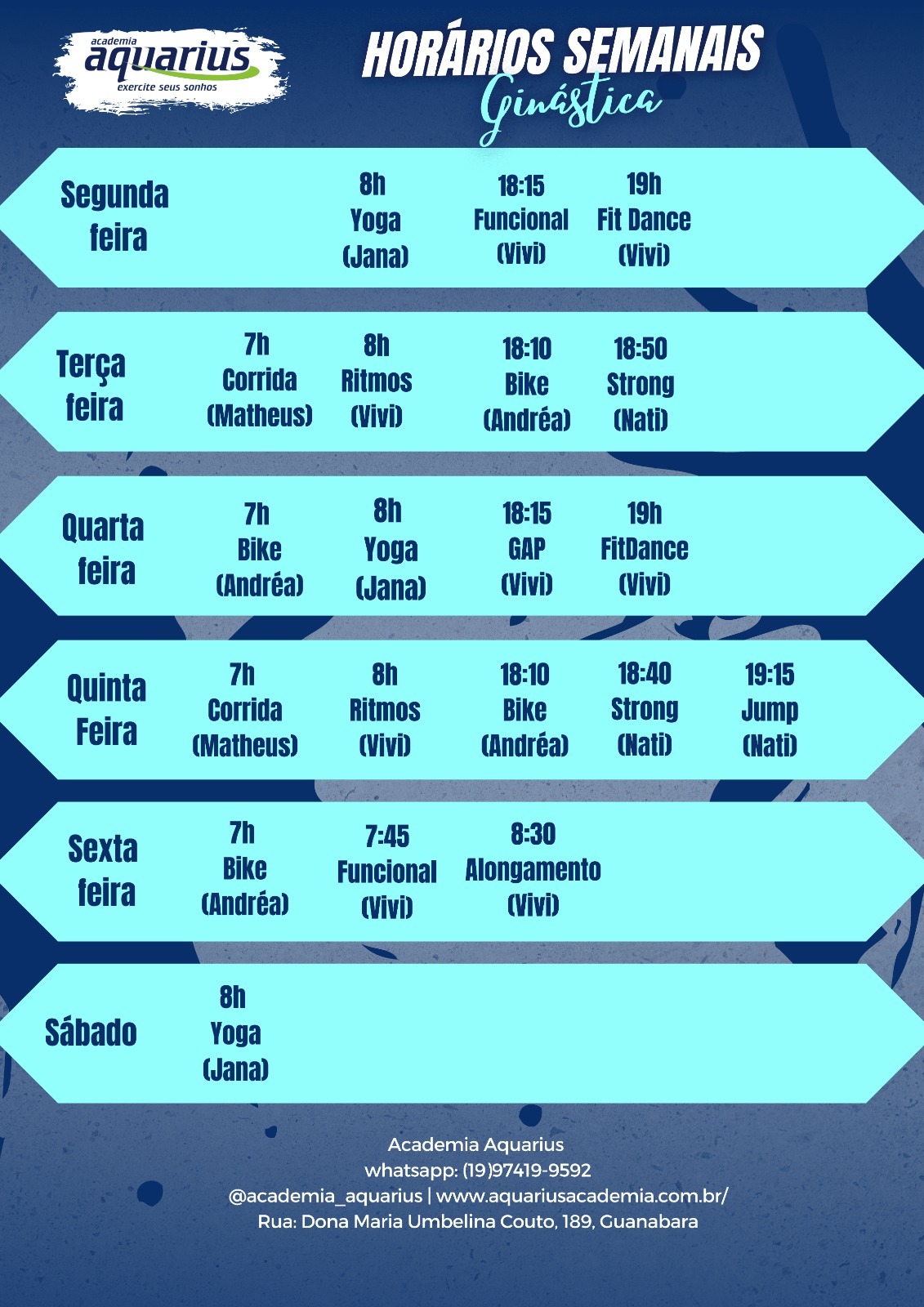 A Academia Aquarius tem 36 anos de história em Campinas. Atende centenas de alunos (gestantes, bebês, crianças, jovens, adultos e idosos) diariamente nas mais diversas modalidades, com diferentes planos para quem busca uma vida saudável.